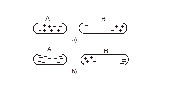 - Đưa vật B không nhiễm điện đến gần vật A đã nhiễm điện (dương hoặc âm),mô tả trên hình thì các điện tử trong vật B sẽ được hút hoặc đẩy trong vật đó làm cho trong vật B phía gần với vật A có điện tích trái dấu với vật A, phía xa hơn nhiễm điện cùng dấu. Đó là hiện tượng nhiễm điện do hưởng ứng