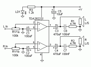 1, Chuẩn bị : 1 ic tda 2822, 1 chiết áp đôi 10k đến 50k , 2 tụ 100uf, 2 tụ 470 hoặc 220uf, 2 tụ 0,1 uf, 2 trở 4,7 ôm, 1 tụ lọc nguồn khoảng 1000uf là đẹp . Led báo nguồn và trở theo sơ đồ.