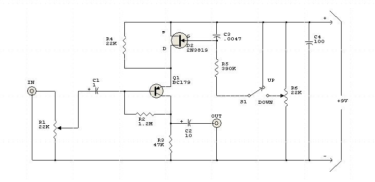 Trong mạch này, Q1 là một bộ khuếch đại đơn giản mà có được kiểm soát bởi một kháng phát biến cung cấp bởi FET Q2 tăng của nó. Trong lên vị trí của S1, C3 thải qua R5 và đạt được của Q1 giảm vì Q2 là lái xe hướng cut-off. Ở vị trí xuống, Q2 tiến hành nhiều hơn, tùy thuộc vào các thiết lập của R6, gây ra một sự gia tăng đạt được. By R5 hoặc C3 khác nhau, giá phai khác nhau có thể có được.