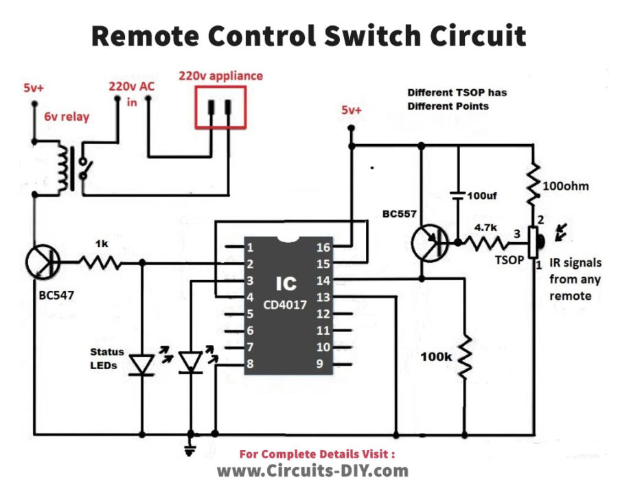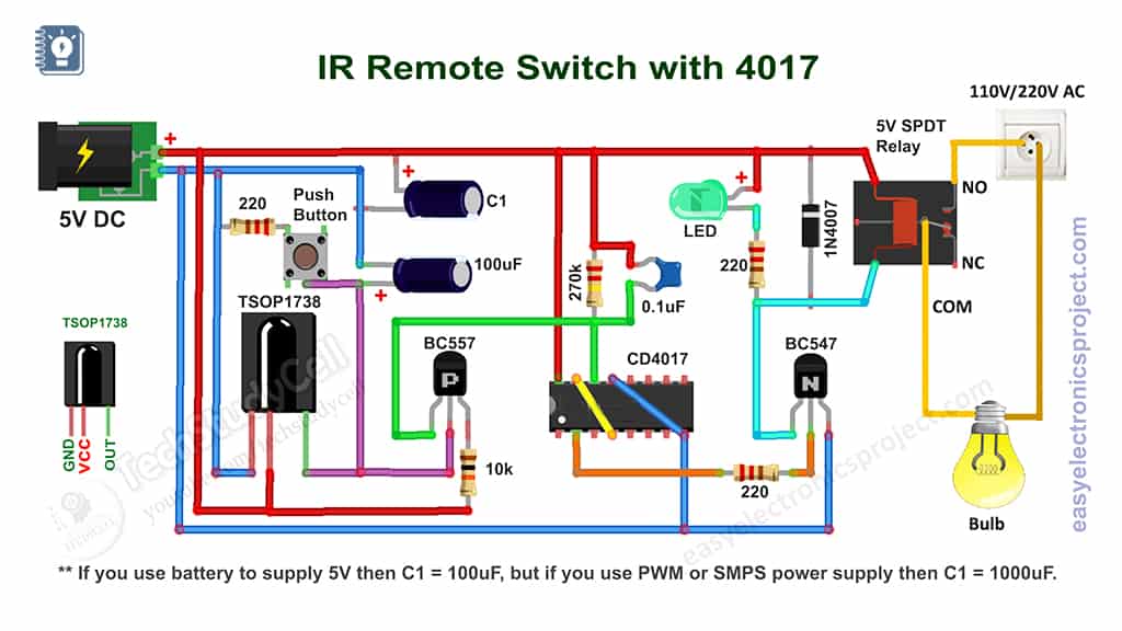 Mạch nhận tín hiệu điều khiển từ xa từ bất cứ chiếc điều khiển nào, chỉ cần bạn bấm nút mạch điều khiển hoạt động. Để lắp đặt mạch tương đối đơn giản như: IC số CD4017, cảm biến hồng ngoại IR TSOP 1738, Relay 5V… những linh kiện dễ tìm hoặc mua. Và bạn có thể ứng dụng nó ở bất cứ đâu và và với bất cứ thiết bị điện nào cần điều khiển từ xa.