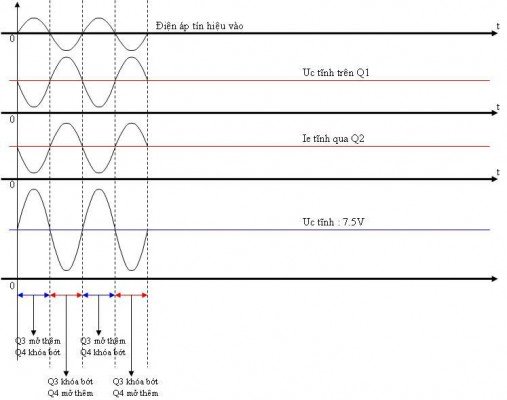 - Q2: Đóng vai trò khuyếch đại tiền công suất được mắc kiểu C chung. Tín hiệu ra ở chân E cấp cho 2 BJT công suất. Ở đây, thực chất ko có tín hiệu xoay chiều nào hết, chỉ có điện áp một chiều thay đổi (lên xuống) quanh mức tĩnh ban đầu. Tín hiệu ra ở chân E Q2 được dùng kích thích (thông qua thay đổi điện áp) cho Q3, Q4.