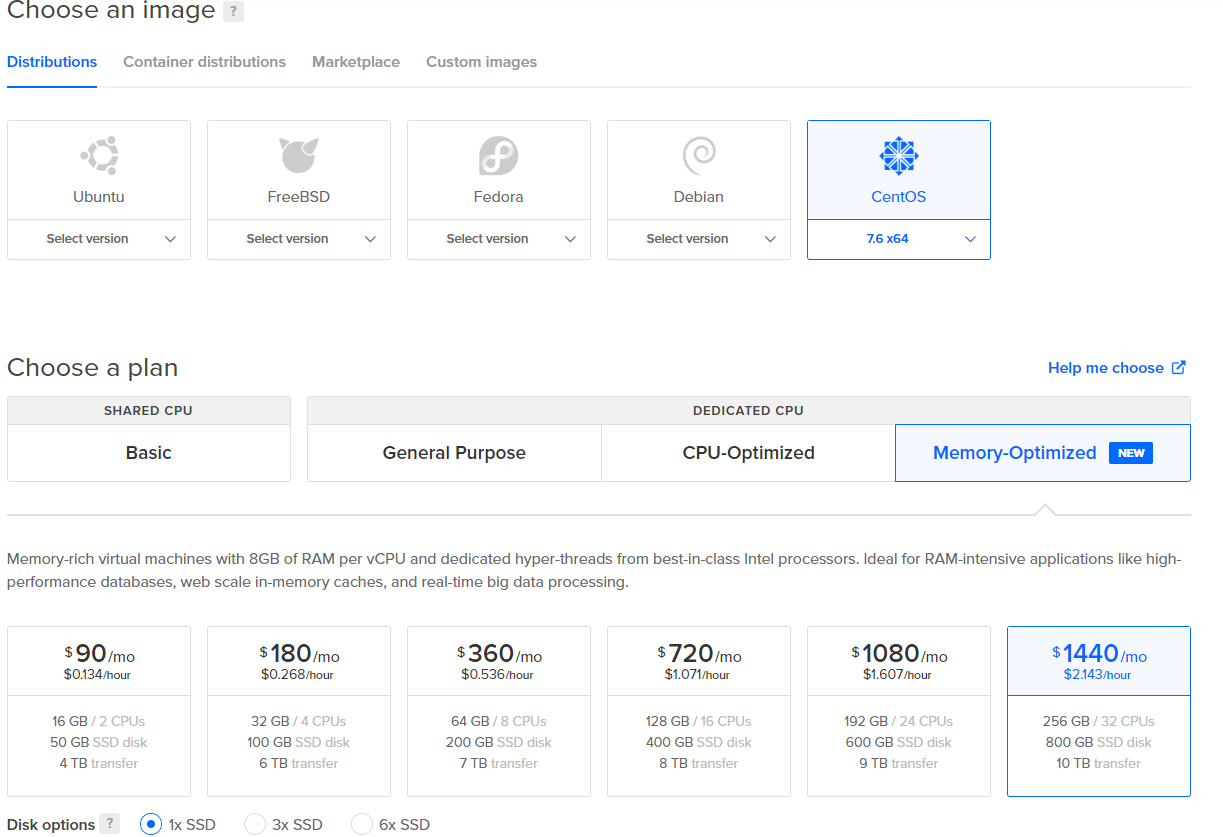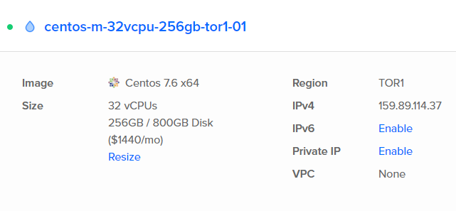 Mình đăng ký ngay 1 con, con này là tài nguyên CPU và ram nhiều nhất của DO rồi. Với giá 1440 Đô chúng ta có 256GB Ram, 32 lõi CPU, 800GB SSD ổ cứng và 10TB băng thông.